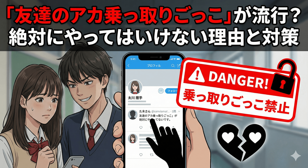 「友達のアカ乗っ取りごっこ」は、やっている側はただのネタ・遊びのつもりでも、実際には不正アクセス・プライバシー侵害・いじめ・本物の犯罪への入り口になりかねない、かなり危険な行為です。