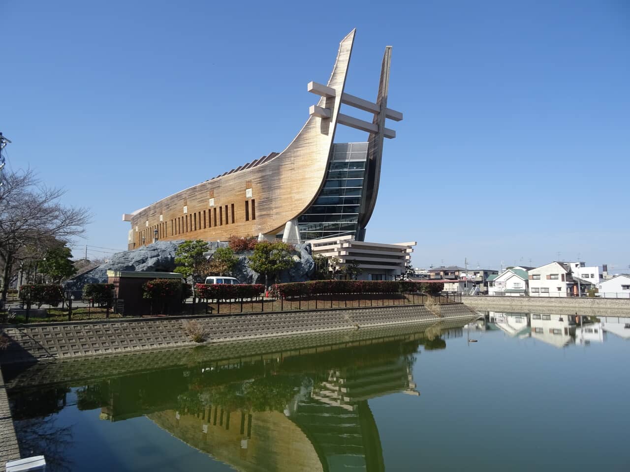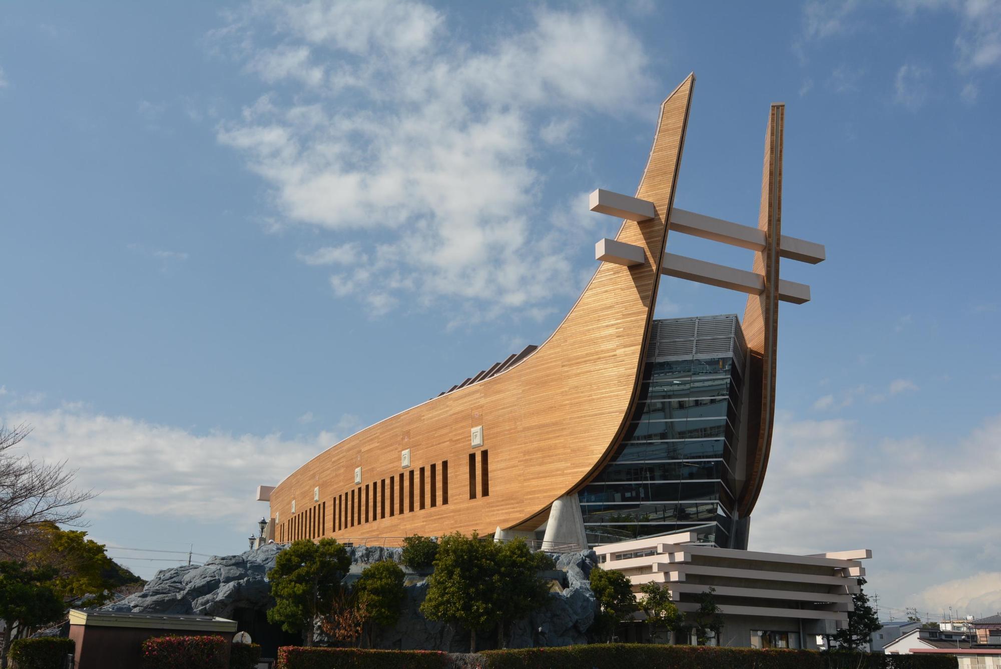 このスポットの面白さは、観光地ど真ん中じゃなくて、生活圏にスッと混ざってるところ。静かな街並みに、急に“方舟みたいな巨建築”が現れるギャップが最高なんよ。